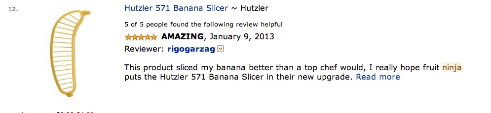 If you haven’t read them yet, you have to check out the reviews — they gave my English classes the most laughs of anything I’ve tried with them all year, and I’ve spent hours perusing the 2500 different reviews of the banana slicer alone. Within these reviews, there are also product forums, where “users” “discuss” the products — and these conversations can be very funny. Additionally, the reviews are subject to ratings (“How useful was this review to you?). Some particularly funny reviews are rated thousands of times for their usefulness.